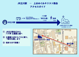 アクセス 25/07/2020 15/12/2025 住所:東京都立川市幸町3-28-30 立川駅(JR)からバスで約10分 ▶︎立川駅(JR)北口を出て、5番バス乗り場からバスに乗車。 「立川駅北口/立川バス」→「砂川九番/立川バス」にて下車。そこから徒歩3分 砂川七番(多摩モノレール)駅から徒歩約15分 教会周辺のマップ googlemap↓